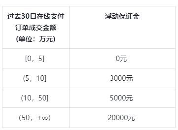 浮动保证金:由店铺上月在线支付订单的销售情况决定,每月1号根据店铺上个月的支付GMV计算浮动保证金应缴金额,每月2号按照下表所列标准调整对应的应缴保证金金额。