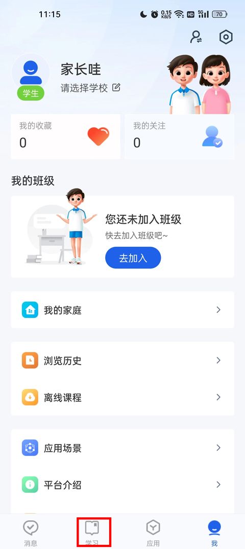 3、登录后,点击底部菜单栏的“我”,并在页面中找到“我的班级”,点击后面的“去加入”;