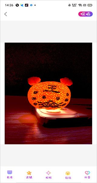 2、添加好就可以对图片进行编辑,裁剪、滤镜、相框、贴纸、标签,编辑好点击保存即可。
