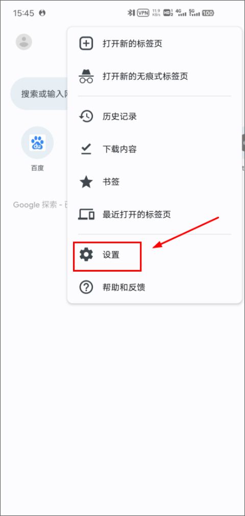 1、打开谷歌浏览器右上角的三个小点处,会出现以下画面,如图所示,会看到“设置”。
